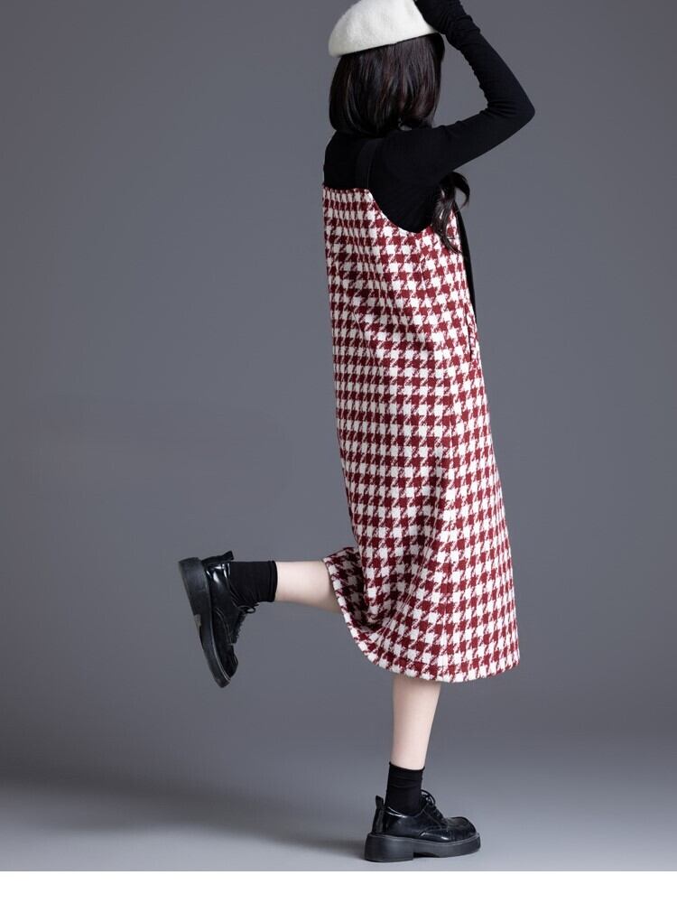 レディース ワンピース サロペット セットアップ 長袖 ラウンドネック フレア フェミニン かわいい シンプル カジュアル おしゃれ チェック 秋 冬 お出かけ 女子会 休日 重ね着 暖かい 防寒 着回し S M L XL レッド