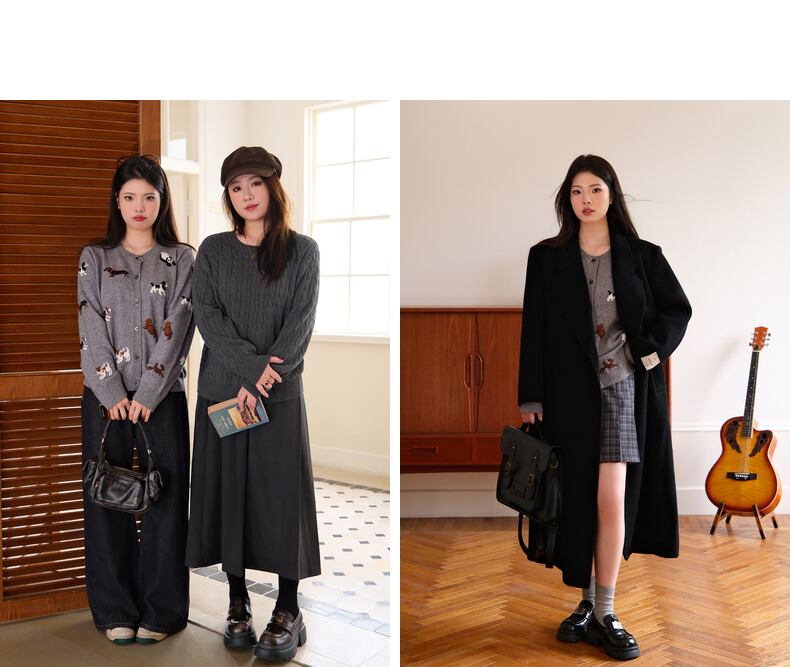レディース トップス ニット カーディガン 長袖 ラウンドネック 2way 中厚手 かわいい カジュアル アニマル柄 犬柄 春 秋 冬 お出かけ 公園 休日 暖かい 防寒 着回し L XL 2XL ホワイト ブラック グレー