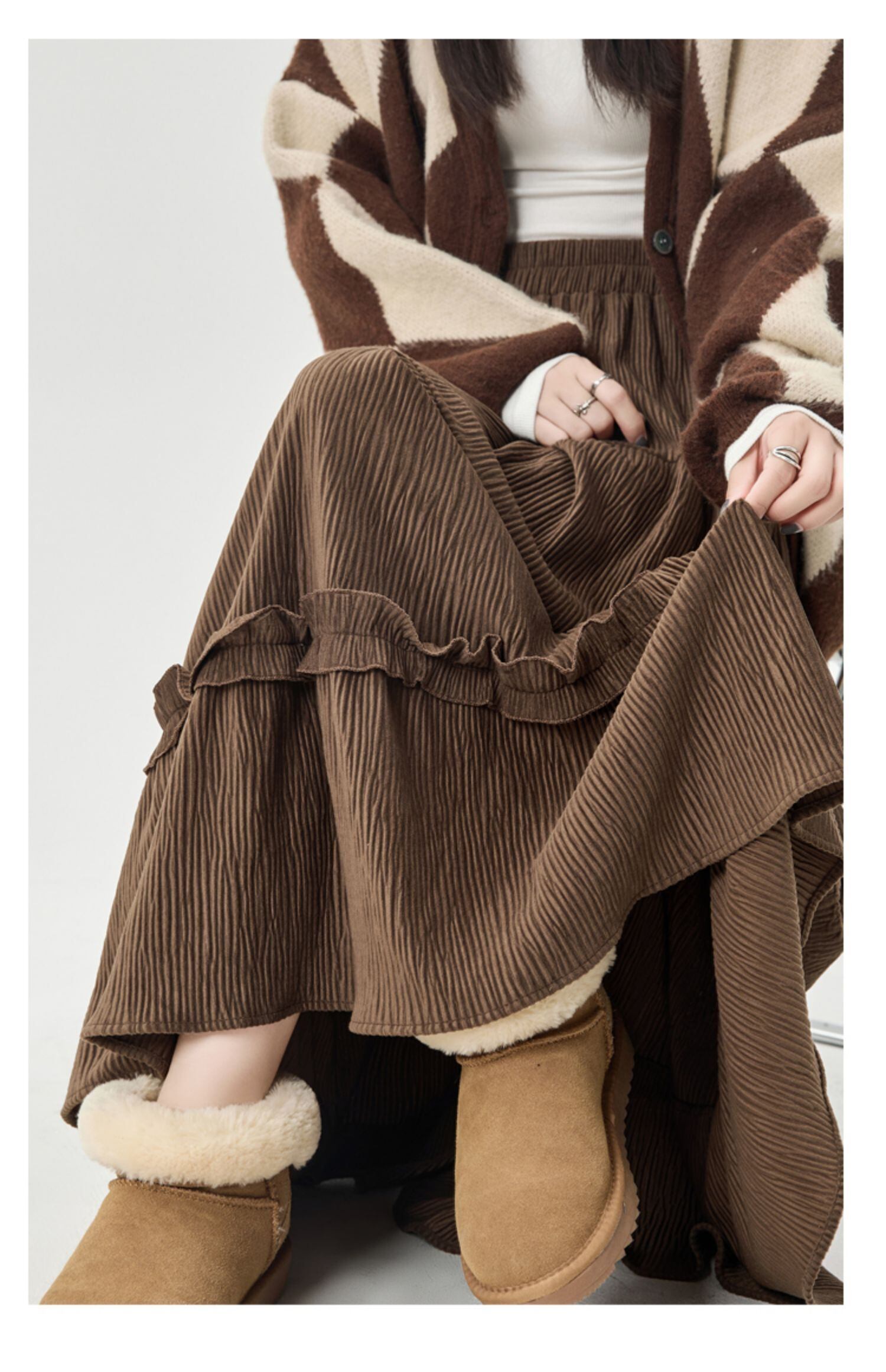 女性らしさを引き出す、ティアードデザインのロングスカートです。ふんわりと広がるAラインシルエットが、気になる部分をさりげなくカバー。ウエストはゴム仕様で、楽な履き心地ながらも、スタイルアップ効果も抜群です。柔らかな素材が肌触り良く、秋冬の寒い季節も暖かく過ごせます。カジュアルなトップスと合わせるだけで、こなれた雰囲気に。デートやお出かけなど、様々なシーンで活躍します。