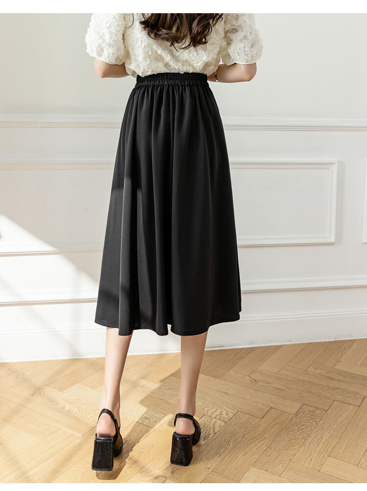 サイドにファスナーが付いていて、ウエストの背面はゴム仕様になっており楽な履き心地です。透け感のある切り替えデザインが、スタイルアップ効果も抜群。大人可愛い雰囲気で、トレンドのチャイナドレス風デザインも取り入れられています。スリットから覗くレースが可愛らしく、女性らしさを演出します。