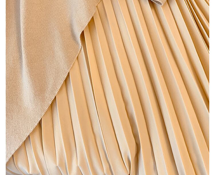 女性らしいシルエットが美しい、ニットとプリーツスカートが一体になったワンピースです。柔らかなニット素材が心地よく、体のラインを優しく包み込みます。上品なプリーツが歩くたびに揺れ、女性らしさをさらにアップ。長袖なので、秋冬の寒さ対策もバッチリ。一枚でサマになるワンピースは、忙しい朝にも嬉しいアイテムです。オフィスから休日のお出かけまで、幅広く活躍します。