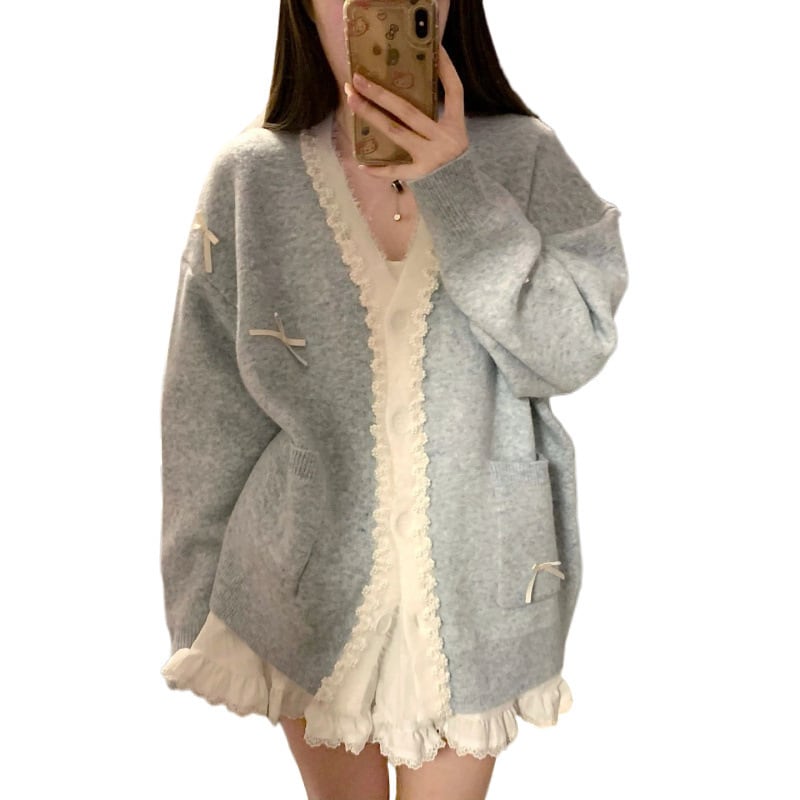 大人可愛いを実現する、レディース トップス ニット カーディガンのご紹介です!長袖のデザインとVネックが女性らしさを引き立て、レースとリボンのディテールがガーリーでラブリーな印象を与えます。ゆったりとしたシルエットは、秋冬の通学やデート、お出かけ、女子会など、様々なシーンで活躍する一着です!